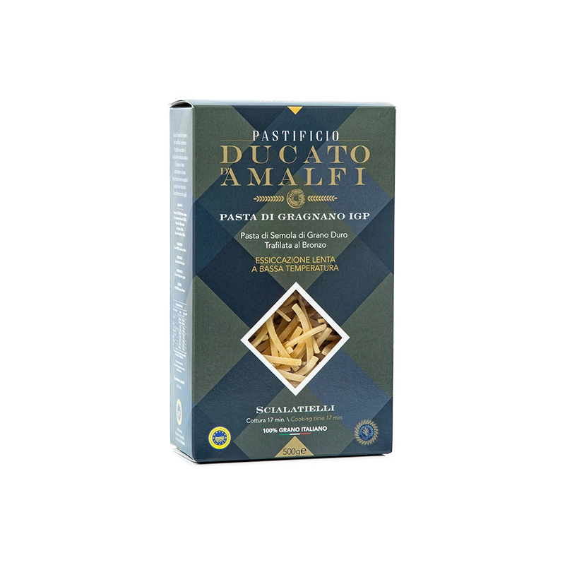Pasta di semola di grano duro di alta qualità 100% italiana trafilata al bronzo, prodotta secondo il tradizionale metodo usato a Gragnano: lenta essiccazione a bassa temperatura, che regala alla pasta un gusto unico ed esalta ogni condimento