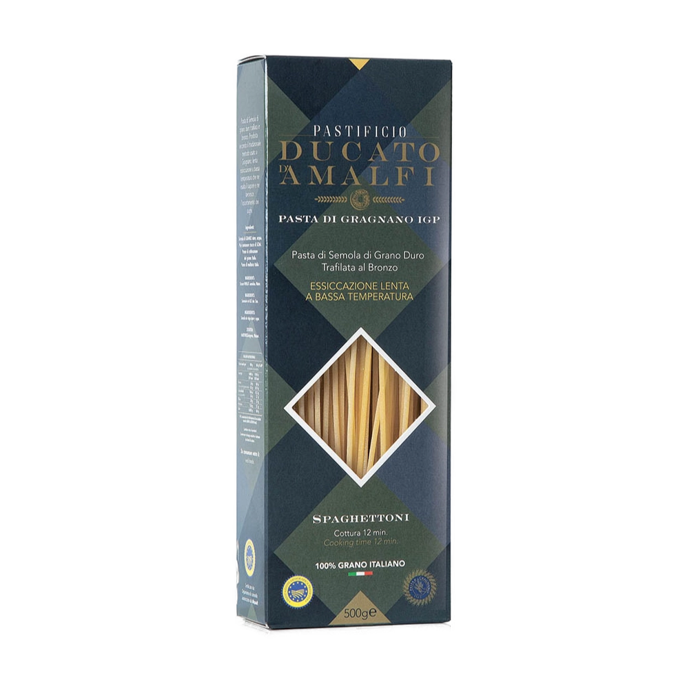 Pasta di semola di grano duro di alta qualità 100% italiana trafilata al bronzo, prodotta secondo il tradizionale metodo usato a Gragnano: lenta essiccazione a bassa temperatura, che regala alla pasta un gusto unico ed esalta ogni condimento